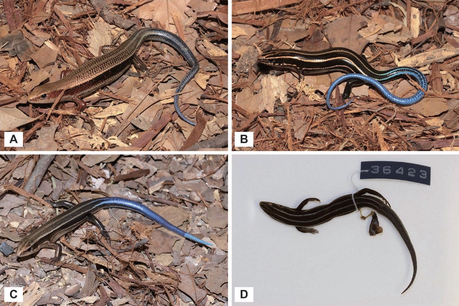 Photographs of Plestiodon barbouri and three allied new species. A, Plestiodon barbouri, topotype, KUZ R70191, Amamioshima island, adult male; B, P. toyamai sp. nov., holotype, KUZ R70182, Okinawajima island, subadult male; C, P. iheyaesilvae sp. nov., holotype, KUZ R70467, Iheyajima island, adult male; D, P. kumesilvae sp. nov., holotype, KUZ R36423, Kumejima island, subadult female.