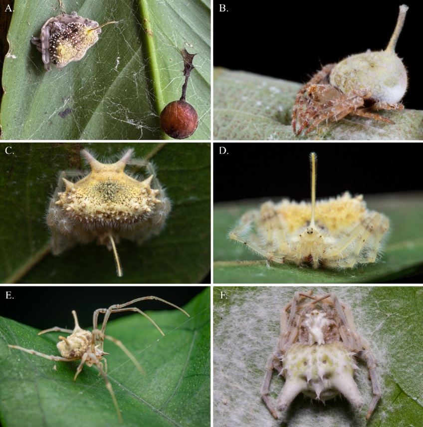 E, Exechocentrus lancearius de Madagascar, -18.966, 48.592 (© Artur Tomaszek). F, Mastophora leucacantha de la costa de Brasil, -23.959, -46.190 (© Thiago Gonçalves Coronado Antunes).