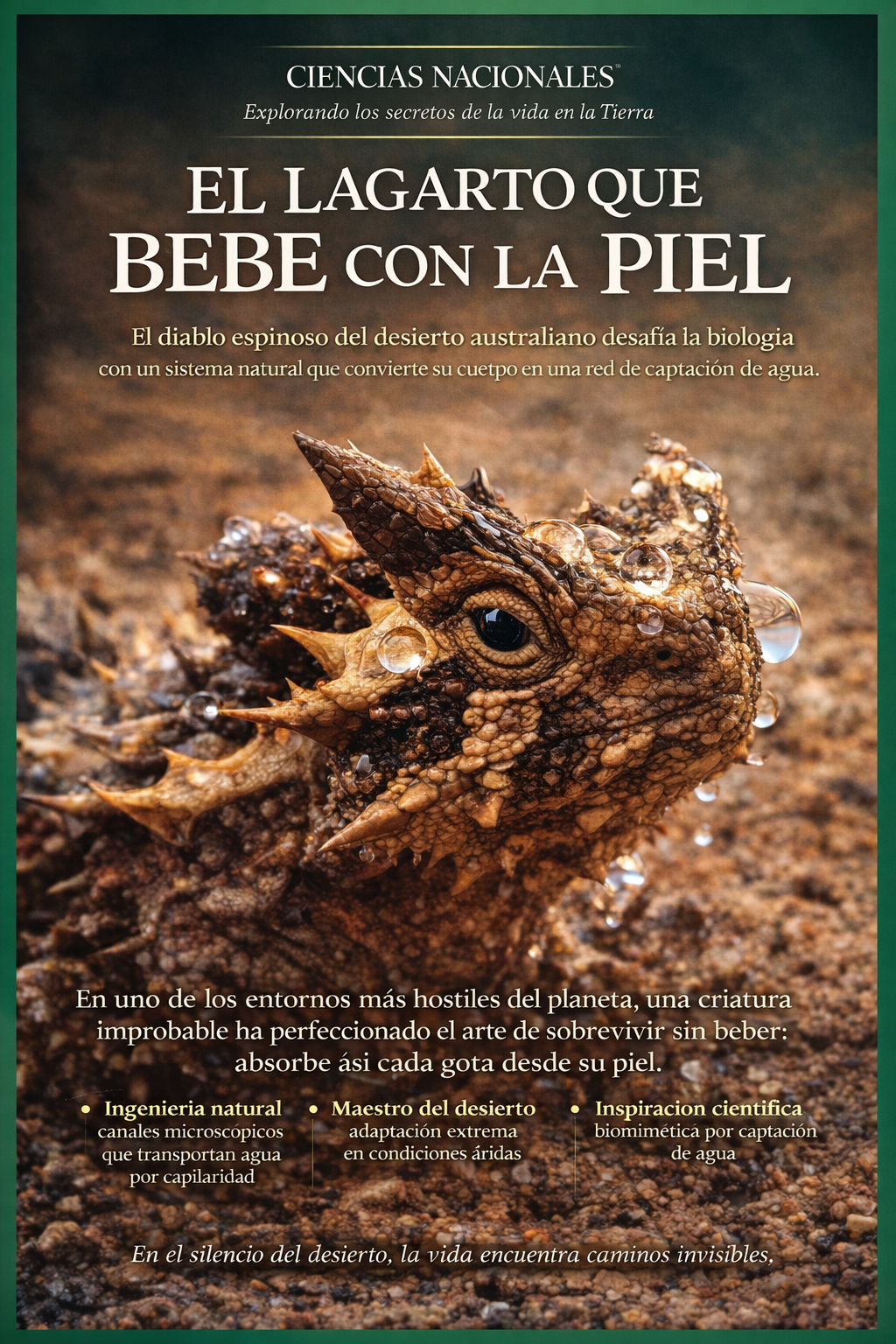 El diablo espinoso no solo es una curiosidad biológica: es una ventana hacia la innovación natural. Su sistema de captación de agua inspira investigaciones en materiales y tecnologías que podrían ayudar a recolectar agua en regiones áridas del mundo.