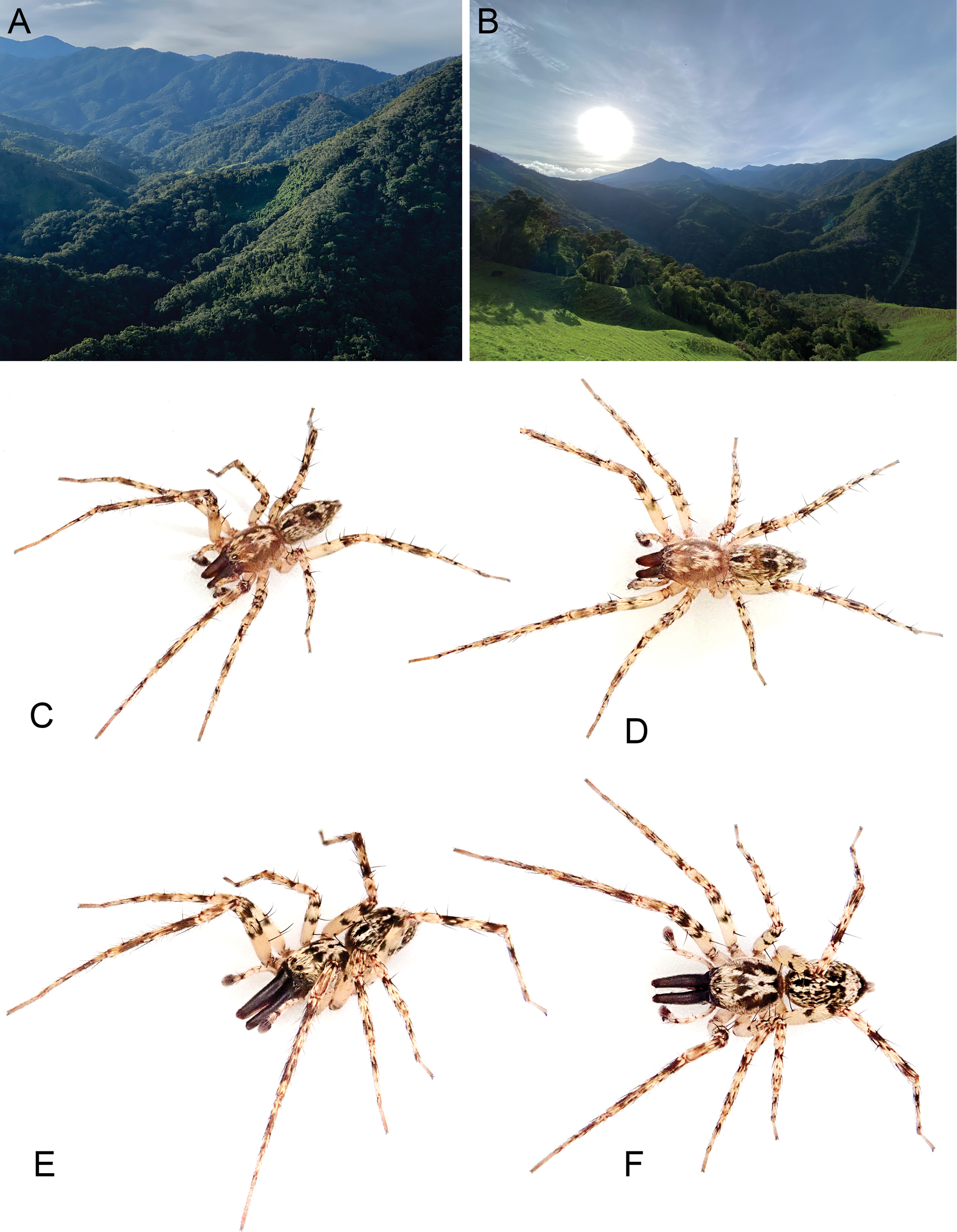 Ilocomba marta Brescovit, 1997. A, B. Hábitat en la Sierra Nevada de Santa Marta, Colombia; C. Macho beta en vista lateral; D. Igual, en vista dorsal; E. Macho alfa en vista lateral; F. Igual, en vista dorsal. Imágenes cortesía de Hernán Iuri.