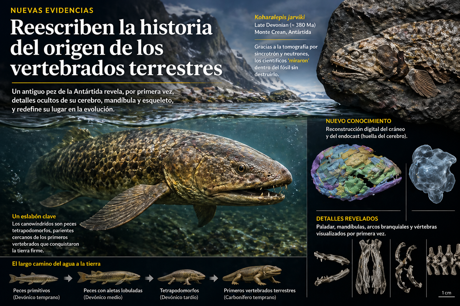 En los confines helados de la Antártida, donde hoy reinan el hielo y el silencio, una criatura de hace casi 380 millones de años vuelve a respirar no en carne, sino en luz. Un fósil extraordinario, perteneciente al enigmático Koharalepis jarviki, está reescribiendo uno de los capítulos más decisivos de la historia de la vida: el origen de los vertebrados terrestres.