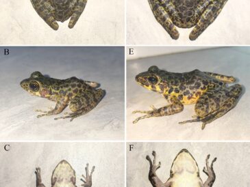 Con un dorso verde salpicado de negro y una parte posterior grisácea, esta rana parece …